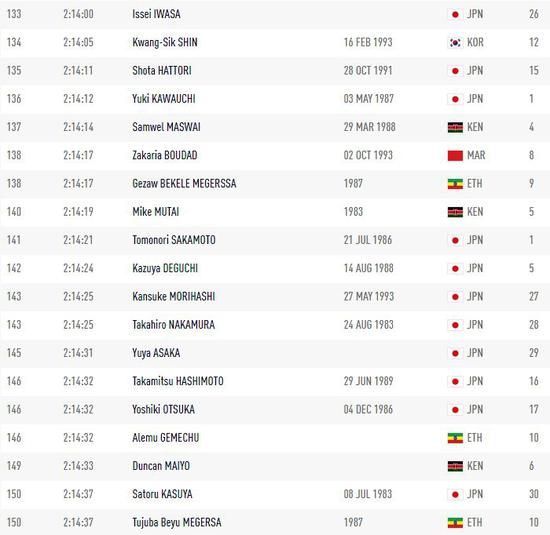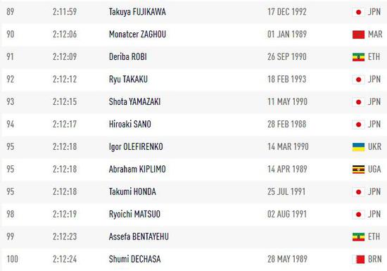 截止到今日,目前国际田联成绩排行榜上,日本已经有10位跑进2小时10分的选手,25位跑进100名以内的选手。 而且我们可以看到,世界100强的成绩都在213以内,那么中国目前年度最好成绩2:14:16是什么样的位置呢?