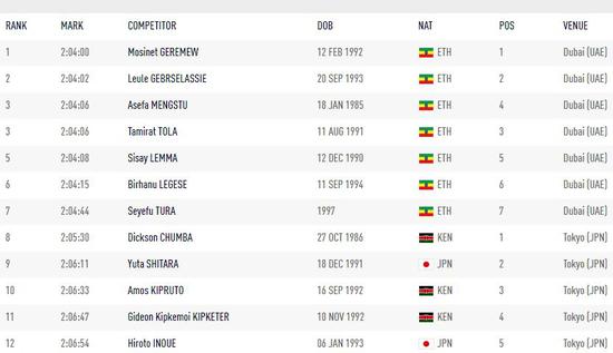 目前,在国际田联马拉松成绩排行榜中,前10名选手当中,埃塞俄比亚占据统治地位,前7名全是埃塞俄比亚选手,并且因为2018赛季才刚刚开始不久,这些好成绩大部分还是在迪拜马拉松创造的。