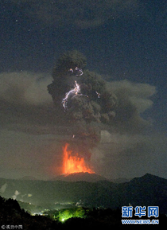 日本新燃岳火山持续喷发 红色熔岩喷涌而出
