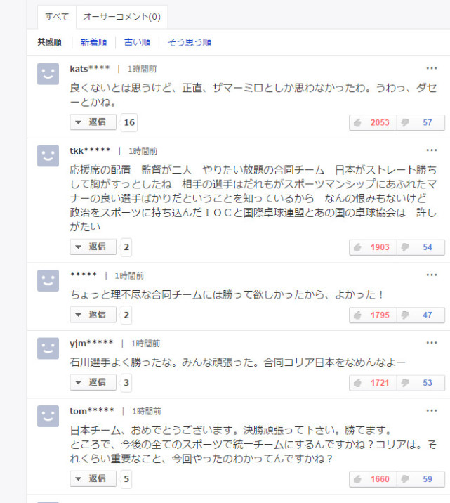 韩朝组队征战世乒赛 腾讯体育5月4日讯(文/应虹霞)瑞典世乒赛,日本女队3比0击败韩朝联队,把万里之遥的日本网友给爽坏了。赛前,不断有日本媒体吐槽称,赛事过程中突然联合组建,“闻所未闻”,也因此,一直吐槽联合组队不公的日本网友赛后找到了发泄口。 鄙视对手的留言触目皆是。“赢不了就是赢不了。不管采用神马肮脏的手段。”“使阴招组建联合队伍,可惜还是赢不了!”“说实话,就想让他们看看自己的半斤八两。最后,成了!”“想小瞧我们?没门!”“让肮脏的对手输得心服口服!帅气!” 多数日本网友吐槽了赛制,盛赞本国球队。 日本网友吐槽 “了不起!面对这样胡闹的对手,没让他们拿下哪怕一局,太棒了!”“联队的组建原本就不公平。当然希望能够一举击溃他们。真是太棒了!”“在不同一般的压力下,三名队员都很好地击败了对手。这实在是让人爽啊。祝贺国家队!” 日本网友也吐槽了比赛中设置应援席,以及两队主帅联合指挥。“这支联合队伍简直就是为所欲为啊!话说,我们也知道,对手每一个个体都是充满体育精神,也是有礼貌的运动员,所以我不恨他们。但我不能原谅将政治轻易搅入体育的国际奥委会和国际乒联。”有人并质疑,未来韩朝联合组队是否会成为体育赛事的一大趋势。 话说,因为大爱这场比赛,也有不少网友批评日本国内转播不力。“话说,东京电视台为啥不现场直播?现在既然知道了结果,已经不稀罕一看。” 有日本网友也批评了近日内外媒体的异常躁动。“最近媒体放飞得很啊!朝鲜问题其实远未解决,可是媒体却狂欢得就像过节!说实在,这样的报道架式,实在觉得违和呢!” 本文系腾讯体育独家稿件,未经授权,不得转载,否则将追究法律责任。 |