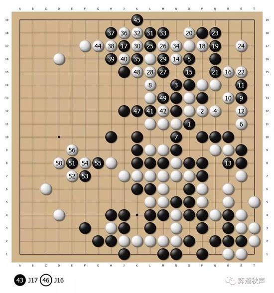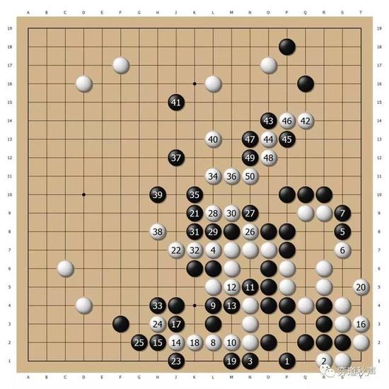 白2破眼,局部双活都不活。 黑3一路扳,上野过于执着了,此时封住白棋,即使弃掉右下,黑棋也是明显优势。 白4先跑出来再说。 黑5点手筋,黑7后,白棋右下不活,棋局一片混乱。 白8托,黑11、13冲断,感觉还是白棋艰难。 白16粘冷静,李赫收气的同时保留做活。 白20先补活一块,松了一口气。 黑21飞封中腹,白22是出头手筋。 黑23在下边补一手,上野的优势意识太强了吧?这串白子本来就被吃了啊。 白24断,李赫抓住机会反击。 白28手筋,白32接成为先手。 白34跳出后,白棋渡过险关。 中腹成为对攻,黑41大跳,继续瞄着整体攻击白棋。 但此时右边黑棋已显薄弱,白42挂入,黑棋优势全失。 黑43以下还要用强,但自身也是漏洞多多。