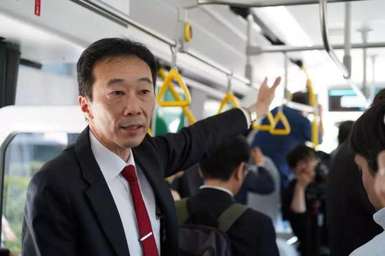 権藤宪治在“SORA”巴士内介绍情况。(新华社记者马峥摄)