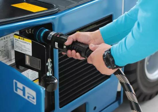日本工作人员给氢燃料电池叉车充氢。(新华社记者马曹冉摄)