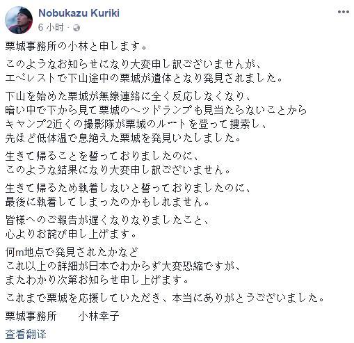 栗城史多 腾讯体育5月21日讯(文/应虹霞)日本登山家栗城史多21日被发现无氧冲顶珠峰死亡。就在死亡原因扑朔迷离之际,在日本,他的工作团队通过其官方博客公布称,栗城史多死于低体温。 前一夜已无力主动更新博客 栗城史多1982年出生于日本北海道,今年是他人生第8次挑战珠峰。4月份从日本动身以来,他一直通过官方博客,细致地向外界报告他的状况。 5月20日晚上10时左右,博客中出现了这样一段文字:“栗城他突感身体不适,决定从7400米的位置下山。接下来的行动未定,待获悉他平安下山的消息,再另行通知。” 从这段文字来看,这应该是栗城事务所的工作人员代为拟发的。这说明,栗城在去世前一夜,已然无力主动更新博客,或是环境条件不允许。 此后,到了21日下午,工作人员再次更新博客,宣告了栗城史多的死讯。 说好了不执着 因低体温去世 “非常抱歉地通告大家,在珠峰下山途中的栗城已经死亡,有人发现了他的遗体。”工作人员在博客中写道。 关于他的死因和当时的情况也有最新披露。 工作团队通过其官方社交媒体发布公告 “在栗城开始下山之后,外界与他尝试无线联络,完全没有反应。在天黑的条件,从山下往上看,也无法看到他的头灯。因此,位于C2营地附近的摄影队伍迅速沿着他的路线攀登实施搜救,就在刚才,他们发现了栗城的遗体,他是因低体温去世的。” “说好了要活着回来,最终却是这个结果,非常抱歉。说好了要活着回来绝不执着,或许在最后一刻,他还是执着了。”博客也推测了栗城史多最后的心情,但也表示,遇难地点的具体海拔高度,还有待跟尼泊尔前方确认后才能公布。 大学山岳部入登山“坑” 重量级粉丝多 栗城史多因冻伤失去九根手指,第8次挑战珠峰的事迹,此前也为内外媒体大量报道。而根据官方博客的资料,栗原史多的登山爱好始于大学时代的山岳部,从此伴随其短暂的一生。 栗城在日本拥有众多粉丝。他从09年开始,一直在进行登山的网上直播,每次都拥趸甚众。 今天,在宣布其讣告的社交网站,短短1小时有超过1000条跟贴,其中不乏名人。日本著名运动员为末大、作家乙武洋匡和名记名人们也纷纷发推掉哀悼这位勇士。 本文系腾讯体育独家稿件,未经授权,不得转载,否则将追究法律责任。 |