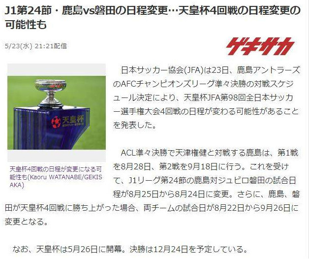 23日下午,亚冠1/4决赛的抽签结果出炉,中超独苗天津权健将先客后主迎战日本的独苗鹿岛鹿角。根据最新消息显示,日本足协在昨天抽签揭晓后当即宣布,将为鹿岛的亚冠之旅开绿灯,为球队调整联赛时间和天皇杯的比赛时间。 鹿岛鹿角将对阵天津权健 鹿岛鹿角从小组赛中突围后,在1/8决赛遇到了中超球队上海上港,他们主场3比1,客场1比2,总比分4比3淘汰了对手晋级亚冠8强,这也是球队在亚冠的最佳战绩。日本足协在赛季前曾经给亚冠四队开会强调,日本在去年浦和夺得亚冠后,今年需要亚冠连霸,这样才能在2021年后的亚冠上恢复3+1的席位。 但没想到的是,只有鹿岛一支球队小组出线,也成了日本足协的唯一希望。日本专业足球媒体《gekisaka》透露,日本足协在抽签后宣布,由于亚冠首回合比赛将在8月28日进行,因此J1联赛第24轮鹿岛鹿角和磐田喜悦的比赛,将从8月25日提前至8月24日,这样可以给球队3天的备战和休息期。同时日本足协宣布,原定8月22日将进行天皇杯第五轮的比赛,而如果鹿岛和磐田均通过了天皇杯第四轮的比赛,那么双方第五轮将进行交锋。一旦两队相遇,天皇杯这场比赛的日期也将从8月22日推迟到9月26日进行,这样鹿岛就避免了在亚冠比赛前一周进行双赛。 日媒报道 而根据中超的赛程,天津权健在8月19日的中超第19轮中客场迎战广州恒大;随后休息一周,在8月26日的中超第20轮比赛中主场迎战贵州恒丰,然后2天之后就是客战鹿岛鹿角的亚冠首回合比赛。而在第二回合比赛前,权健在9月15日的第22轮比赛中主场迎战大连一方,随后在9月18日的亚冠次回合比赛中主场再战鹿岛。 对于权健来说,8月26日主场对阵贵州的比赛,距离首回合亚冠时间过近,权健高层李玮锋已经表态,有必要的话权健会为了亚冠适当放弃联赛。如今日本足协已经出手,中国足协如何接招?(黑嘉丽) 相关推荐