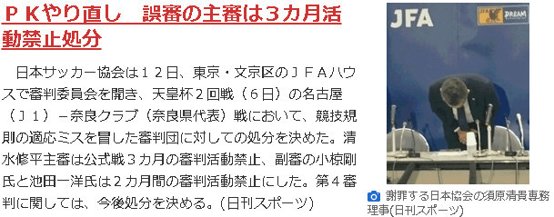腾讯体育6月13日讯 日本天皇杯名古屋逆戟鲸对阵奈良比赛中,主裁判清水修平出现了严重误判,日本足协对其直接处以禁哨3个月的重罚。 6月6日进行的日本天皇杯第2轮,J1联赛球队名古屋逆戟鲸对阵半业余的奈良俱乐部,两队上下半场各进1球,加时赛双方都没有进球,最终进入点球大战。点球大战中,一位奈良俱乐部球员主罚时违规使用假动作,主裁判清水修平让他重新罚点球。 然而根据有关规则,用这样的方式罚点球应该被判无效,而不是重新罚,显然清水修平在这件事上出现了重大的误判。之后,日本足协及时作出更正,本场比赛的点球大战部分将重新踢。 日本足协裁判委员会承认,裁判组出现这样的错误是非常罕见的,是应该避免的,点球大战也原本可以不用重新踢。日本足协在向外界道歉的同时,也对主裁判清水修平处以禁哨3个月的处罚,此外助理裁判小椋刚和池田一洋禁哨2个月。 在中国的中超和中甲联赛中,执法裁判偶尔也会出现重大错漏判,但是中国足协却比较少的对犯错误的裁判进行重罚,这一点中国足协应该向日本足协学习。 (歌德) |