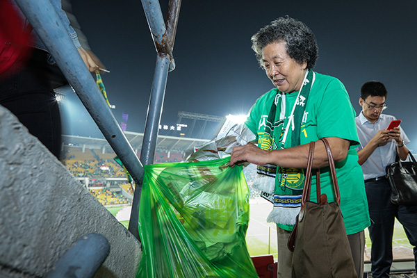 球迷“九奶奶” 在国安队比赛后收拾垃圾。 中国球迷并不落后 其实,有如此举动的不只是日本球迷。在小组赛首场赢下哥伦比亚之后,输球的哥伦比亚球迷,也主动留下来清理了赛场遗留的垃圾,上演了两队球迷共同维护赛场清洁的温馨一幕。 而中国球迷,也多次有过这样的举动。