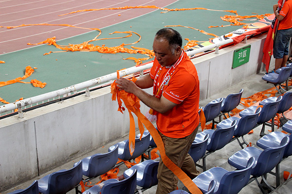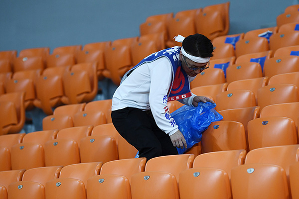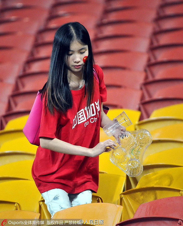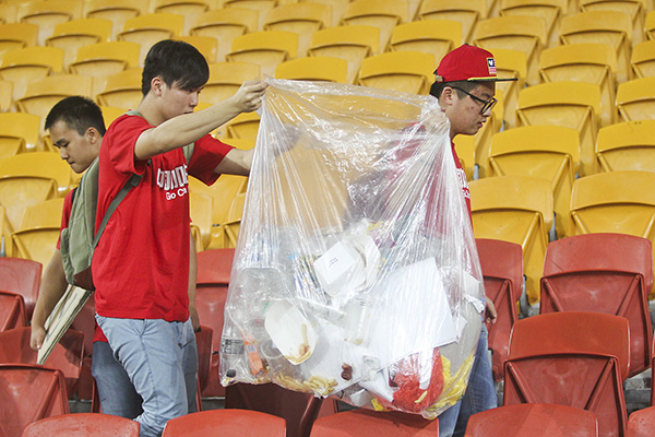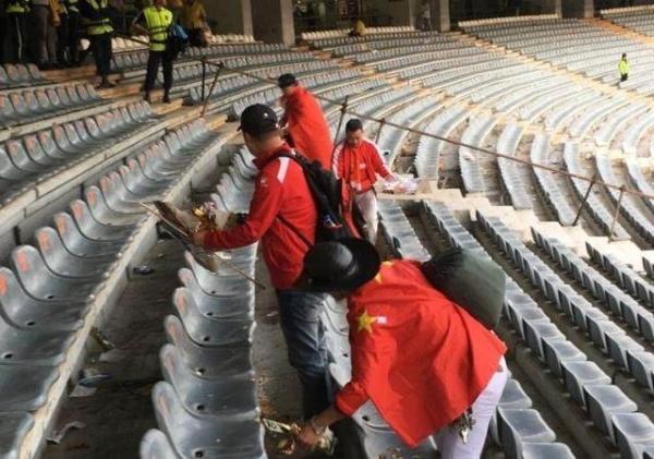 中国球迷在场外收拾垃圾。 球队赢球的同时,远道前去助威的中国球迷也展现了自己的高素质。中乌之战后,中国球迷主动带走看台上的垃圾,留下一个洁净的球场。 据当时《人民网》报道,中国球迷的举动,就让亚足联官员为之动容。