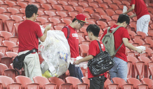 中国球迷在对阵伊朗比赛后清理垃圾。 其中带头的球迷“磊子”还被亚足联评为最佳球迷,获赠亚洲杯比赛用球一个。这在中国足球历史上还是首次。 随后,这样的举动也被更多的中国球迷效仿学习。