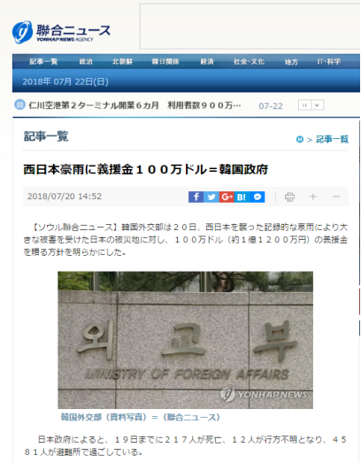 原标题:韩国政府宣布向日本灾区捐款100万美元 日网友:不需要 据日本NHK电视台报道,日本外务省7月20日说,韩国政府当日致电日本外务省称,决定向西日本暴雨灾区捐款100万美元。 对此,日本外务省回应称,“非常感谢韩国政府对日本的援助。”同时,外务省还宣布,日本外务大臣河野太郎将在下周一(7月23日)与韩国驻日大使李洙勲举行会谈,并将在会谈上向韩国政府表达谢意。 此外,韩联社20日也证实了该消息。韩国外交部当日发布公告称,韩国政府将捐款100万美元用于支援日本暴雨灾区(重建工作)。