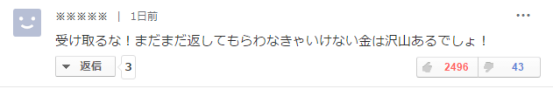 网 友ban*****:估计等着我们10倍返还吧?没关系,我们不需要。 还有一些日本网友压根不相信韩国会落实对日本的捐款。