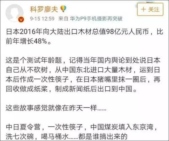 在2006年另一家报纸的报道中,一次性筷子和森林覆盖率仿佛也成了不共戴天之敌。 日本的森林覆盖率高达65%,但他们很珍惜自己国土上的树木,一次性筷子基本全靠进口。中国森林覆盖率还不到17%,却成了日本一次性筷子的最大出口国。 仿佛中国人用一次性筷子就把森林砍光了似的…… 实际上,一次性筷子的确最早发端自日本,后来,日本也的确开始从中国进口一次性筷子。但是,原因不是日本人使坏故意掠夺中国的森林资源,而是因为便宜。 据日本《每日新闻》的报道,上世纪80年代,北海道和奈良是日本一次性木筷的生产基地,当时一双筷子的价格是20日元(约0.18美元)。不久,中国的产品就占领了这一市场,一双筷子的价格仅为1至2日元。日本一次性木筷子生产商的数量也从70多家下降到8家。 同样一双用过就扔的筷子,日本货卖20块一双,中国货卖1块钱,你说商家买谁家的? 筷子的迷思算是破解了。 这则“打脸”的消息引发了许多网友的更多共鸣:原来,大家小时候都听过关于传说中的“日本”各种故事。中日夏令营,一次性筷子,中国煤炭填入东京湾,洗七次碗,喝马桶水……