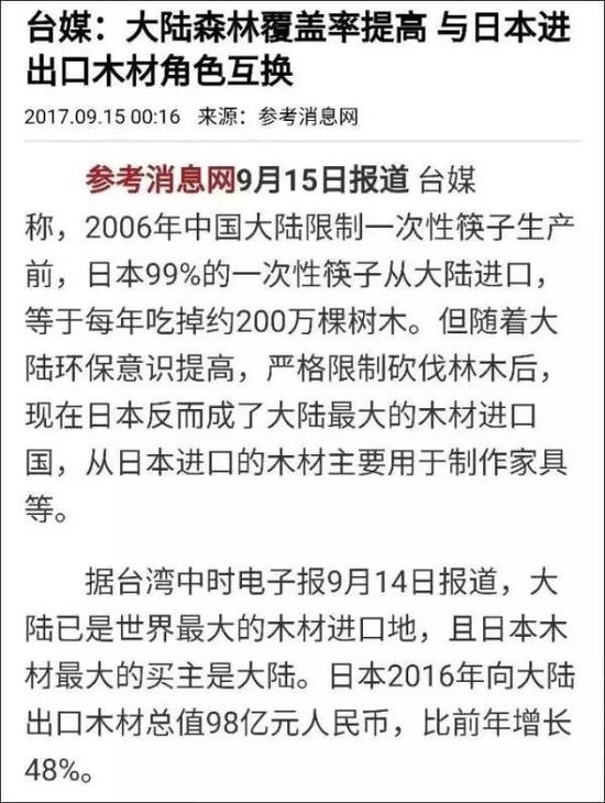 3 后市:中国修法为日本杉木“松绑” 在2017年九州经济圈出口的原木中,杉木的比重占到了80%。资料显示,杉木是一种广泛分布于北温带的针叶树种,属中低档次木材,在家具制作中有着较高的性价比。然而,有分析指出,日本杉木气味较为刺激,且多为黑心、色差较大、多节疤,因此在中国市场上较难受到消费者接受,因此多作为箱包包装,托盘垫脚等产品的原料。此外,按照作为中国建筑基本法规的《木结构设计规范》,日本的杉木和柏木都不能用作木制建筑的大梁和柱子。 2017年,中国修订《木结构设计规范》,确定自今年8月起将允许日本产杉木作为木结构建筑物的结构木材使用。一家名为日本木材出口振兴协会的日本民间组织在其官方网站分析称,在中国收入较高的沿海地区,近年来木屋正成为一种日益风靡的居住选择。另外,中国商品房交付中精装修房产占比日益增加,也带动了室内装饰行业的木材需求。据此看来,日本木材行业未来将有望在中国房地产市场中分得一杯羹。 另一方面,中国国内林木禁伐、环保督查等政策影响也将在一段时间内持续。中国海关最新统计数字显示,今年1至6月份中国原木及锯材进口量为4847.2万立方米,与去年同期相增加9.7%。 日本杉树的产量能否跟得上中国的旺盛需求呢?据悉,杉木生长至20年左右方可进行全面采伐更新,从生长周期来看并不属于速生林钟。但是在日本二战后种下的人造林中,柳杉比重占到了44%。目前,这批树木已属于成熟林,存在着充足的产能潜力。 福冈县门司海关估计,今年的日本木材出口量还将在去年基础上进一步上涨。而由宫崎、鹿儿岛两县4个森林协会组成的木材出口战略协议会会长堂园司在接受日本媒体采访时表示,“能应对中国的爆买和特别订单”,但是“4个森林协会联合起来方可确保供货量”。 拓展阅读 日本从来不砍树,用中国的木材做一次性筷子?中国愚昧和丑陋展露无遗?真相其实是。。。 文 | 朱新伟 本文转载自微信公众号“观察者网”(ID:guanchacn),原文首发于2017年9月15日,原标题为《憋屈多年,中国人加给日本的光环终于破产了!》,不代表瞭望智库观点。 小时候听过这个段子吗? “日本从不生产一次性筷子,完全依赖进口。96%的日本一次性筷子来自中国。而且日本人还注意一次性筷子的回收,回收后制成纸浆, 再出口到纸浆紧张的中国。” 日本人先进的环保意识、精明的商业头脑和中国人的“愚昧”和“丑陋”,全都浓缩在这段话里……这么年过去了,小编依旧印象深刻。