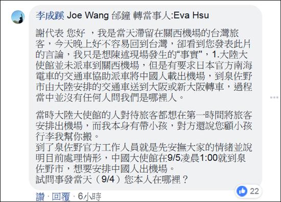 更有亲历者“打脸”谢长廷,指出大陆方面未派车进入关西机场,但要求日方安排车辆将中国游客送出机场。 该网民还指出,大陆人员没有人问他们是哪里人,第一想法是安排旅客出机场,由于他当时带着孩子,工作人员还提出帮其搬行李让他能照顾孩子。