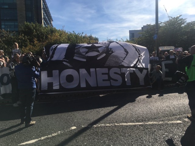 腾讯体育英国利物浦特讯(特约记者Gemms发自圣詹姆斯公园球场)北京时间9月29日。 英超联赛第七轮可谓好戏连台,南边伦敦改编了一部红蓝之战的历史剧、西边曼彻斯特上演着曼联穆鸟“三年之痒”的网红剧,而北方重镇之一的纽卡斯尔表示不服也来蹭个热度,全城自编自导了一部黑心老板、苦逼主帅和赤诚铁粉间相爱相杀的连续剧。 黑心老板惹众怒,球迷飙歌怼看台 对于很多非英超准球迷而言,老牌劲旅球队纽卡斯尔的成名不是因为传奇球员阿兰希勒,也不是因为世界名帅贝尼斯特,而是一部电影——《一球成名》。早在2005年上映的这部电影讲述了一个墨西哥移民在圣詹姆斯公园球场圆梦的青春励志故事。怀揣着探访这部影片取景地的好奇心情,笔者从利物浦出发搭乘火车一路北上,耗时四个小时终于抵达泰恩河畔的纽卡斯尔。从市中心的火车站到球场只需搭乘地铁,经过2站即可到达(地铁站名和球场同名都叫圣詹姆斯)。 抗议召集海报 整个地铁站都被打造成充满浓郁的俱乐部色彩:四周的墙上、扶梯台阶上方的横梁,到处都印有俱乐部标志性的黑白竖条纹和各种球队历史海报,犹如胶片电影一帧一帧场地重播着昔日的辉煌。地铁出口处的地上甚至勾勒了一个小型足球场,烙刻着球队历史上传奇球员的掌印/鞋印,仿佛希望他们能一辈子都驰骋在球场上。 没想到一出地铁站画风突变,球场外聚集着大量情绪激动的球迷,有拉横幅的、有举旗的,还有开着面包车挂着大显示屏的,他们齐刷刷地喊着口号“你这个该死的肥佬,滚出我们的俱乐部”,看这阵势感觉像是来打架的。笔者小心翼翼地找了一位卖队刊的大叔打听发生了什么事。大叔说“这里在搞球迷抗议游行,共同反对俱乐部老板”。这么大胆?敢动金主爸爸?再细细询问,原来是老板阿什利太黑心,“以公谋私”(把通过俱乐部赚的钱投资自家公司)、“吝啬又食言”(承诺花钱重塑俱乐部,但既不给主帅资金作夏季引援,也不投资修缮场馆、打造青训)。 所以球迷们不爽了,在推特上专门建了个名为“团结一致反对阿什利”的群,号召今天比赛日前游行示威。据说类似的示威活动从赛季初就开始,已经好几轮了。此情此景不禁有一种早几年国内春节前农民工聚众讨要薪资的既视感,吓得笔者速速避开只敢远观,可不敢当“群众演员”。 赛前纽卡球迷举行抗议活动 一进球场,发现临近赛前半小时,可看台上大片大片地空着,直到快开球时才一下子涌进了许多球迷,估摸着刚才都在外面游行耽误了进场吧。就在球员们出场准备开球时,看台上一阵骚动,原来是俱乐部老板今天来现场了。球迷们齐刷刷地回头望向VIP席位喊着“你这个混蛋,快点滚出去!”。据说阿什利上一次到访观战还是去年2017年5月,如此的漠视态度也难怪会引众怒。而老板面无其事地笑着对着镜头的画面,简直是火上浇油,球迷们愤怒地唱出“如果你憎恨阿什利,请站起来;一旦阿什利卖掉俱乐部,我们就开始狂欢”,紧接着看台上掀起了一波人浪。通常球迷们只有在庆祝的时候才会玩人浪,这种自嘲的风格大概就是典型的英式黑色幽默吧。 输球输志恨蔓延,爱恨交加情难断 球迷们这种消极的情绪也影响着球队的表现。在整体局势良好的状态下,第30分钟纽卡后卫禁区内防守犯规被罚点球。但裁判的判罚引来主队球迷的争议,全场嘘声一片,沟通确认了好一会儿依然坚持原判。主队球迷试图通过嘘声干扰莱斯特的主罚球员,但无济于事莱斯特城1-0领先。下半场纽卡有两次疑似可以判点球的机会,但裁判都未予理睬。主场球迷们对此感到很丧,除了寥寥几声嘘声,连骂也骂不动了,只听后排有位球迷连连感慨“哎......没救了没救了.....裁判和老板都是一样的傻”。 赛后看台上方的莱斯特城球迷 下半场主队球员们传球失误连连,三番五次地出现球踢到对方防守球员弹射砸到媒体区席位。吓得一旁的记者调侃“我们不是老板,别把我们当炮灰使啊”。待到第73分钟莱斯特城再下一城2-0后,纽卡球迷已经无望地开始陆续退场了,比赛结束时空荡荡的球场只剩天台上的客场球迷们还在兴高采烈地庆祝久久不愿离去,有种误以为走错片场的感觉。 此轮蓝狐在鹊巢偷得3分后,纽卡新赛季已经连续7轮未胜,排名跌至保级区,真是“大风吹倒帅字旗”——出师不利。关于“主教练拉法能否保住帅印”的质疑声此起彼伏,不过大多数的纽卡球迷对拉法还是有很深切的情感,并不希望他离开。即使在抗议老板的种种劣行时,也不忘力顶主帅,纷纷拉出“这里是贝尼特斯的家”、“只有拉法执教,我们才去现场看球”的标语。 纽卡球迷在场内外打出标语支持主教练 赛后笔者采访了一位名叫保罗的纽卡球迷,他失望地说道“我不希望拉法离开,他是个好人,他对球迷很真;他也是个好教练,要知道他曾经带领过利物浦夺得欧冠,执教过国际米兰、切尔西、皇马这种豪门,但他却愿意留在纽卡这样的小地方,一待就是五年。但恐怕我们这次留不住他了......真他妈的希望自己是个有钱人,把那个阿什利扔出去。” 在希望的田野上,播下梦想的种子 虽然和曼联主帅穆里尼奥一样都排在英超新赛季下课第一人的热门名单中,但不同的是拉法最大的资产是他怀有梦想,相信球员、相信球迷并渴望取得胜利,赛后新闻发布会面对媒体咄咄逼人的追问,拉法无奈的表情中隐藏着坚定的信念,一直