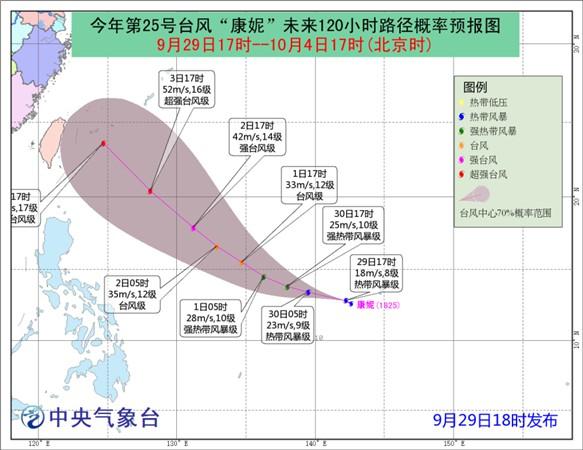 大风预报:29日20时到30日20时,黄海南部、浙江沿海、福建北部沿海、台湾海峡、台湾沿海将有7-8级大风;东海和台湾以东洋面将有8-10级大风,东海东部的部分海域风力可达11-12级,“潭美”中心经过的附近海域风力有13-15级,阵风16-17级。 受“潭美”和冷空气共同影响,9月29日夜间到10月1日,日本九州岛、四国岛和本州岛及其附近海域将先后出现强烈的风雨天气。 另外,今年第25号台风“康妮”(热带风暴级;英文名称:KONG-REY;名称来源:柬埔寨;名称意义:高棉传说中的可爱女孩)今天(29日)下午2点钟在西北太平洋洋面上生成,下午5点钟其中心位于美国关岛西偏南方约290公里的洋面上,就是北纬12.8度、东经142.2度,中心附近最大风力8级(18米/秒),中心最低气压998百帕,七级风圈半径200-300公里。 预计,“康妮”将以每小时25公里左右的速度向西偏北方向移动,逐渐趋向台湾以东洋面,强度逐渐加强。10月4日前“康妮”对我国海区无影响。 |
