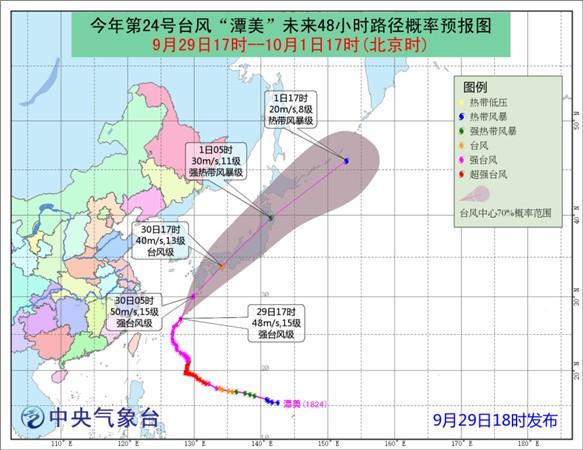 中国天气网讯 中央气象台9月29日18时继续发布台风预报: 今年第24号台风“潭美”(强台风级)的中心今天(29日)下午5点钟位于东海东南部海域,就是北纬27.1度、东经127.9度,中心附近最大风力有15级(48米/秒),中心最低气压为945百帕,七级风圈半径430-500公里,十级风圈半径150-230公里,十二级风圈半径80-120公里。