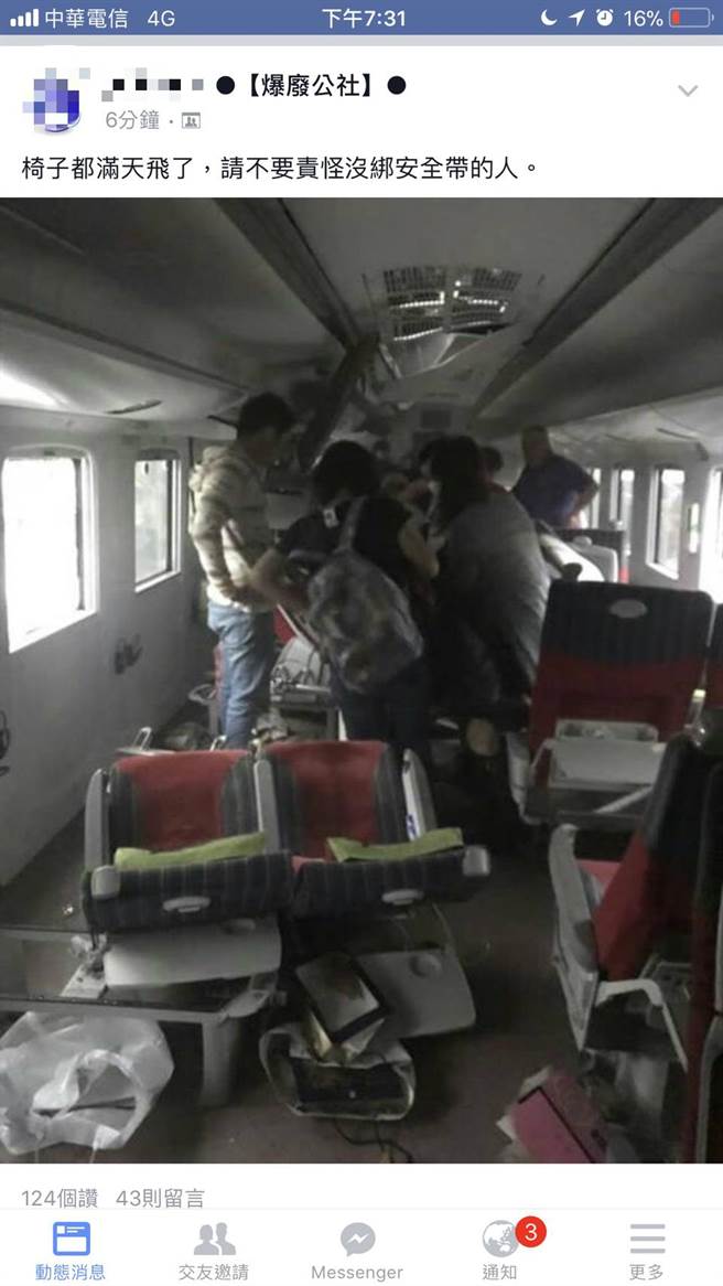 事故车厢内部 (图:乘客社交媒体) 司机称辗到“不明物体” 车长曾广播引擎故障 台铁普悠玛列车出轨事故的起因引起外界关注,多名乘客均指出事发前列车的行驶过程并不正常,包括行驶途中不断走走停停、无故急煞两次、出现剧烈摇晃,以及曾传出引擎故障;宜兰县议员邱嘉进表示,根据现场消防局人员表示,驾驶列车的司机更表示曾辗过“不明物体”,疑似是导致事故的原因。 “一开始搭就觉得怪怪的!”有幸运获救的乘客指出,列车事发前曾无故急煞两次,令车厢乘客感到讶异。亦有网民在社交网站发文指出,其妹妹就在该辆普悠玛上,虽然幸运地仅有一些擦伤,不过她称该列车途中不断走走停停,不是很正常的在行驶,结果就出事了。 刚好坐在列车上的台湾公路管理部门第四区养护工程处玉里段长陈鹤仁称,行驶期间感觉列车剧烈摇晃,之后就发生意外。他证实有乘客表示,从台北上车后到发生意外前,沿途暂停多次,原因不明,并称不知是否和出轨意外有关。 一名事发时身在车上的张姓女子受访时依旧心有余悸,她称事发时突然一阵剧烈摇晃,坐在车厢右侧的乘客随即全被抛飞到车顶。张女并表示,事故前车长曾广播称引擎故障,并临时暂停列车。乘客柯先生表示,他是坐等第二节车厢,很多人扭到脚、头擦伤,仍不知发生何事,之后有乘客打开车厢门,看到白烟冒起,才知后面的车厢出轨翻覆。很多人跟他一样,惊吓之余,庆幸自己检回一命。 在现场救援的消防员更表示,驾驶该班列车的司机曾称,在列车出轨翻覆前,曾辗到过不明物体,随即就发生意外。对于事故的确实起因,目前当局仍在调查中。