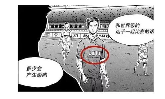 比赛中,国足7号球员孟盛先入一球但被判无效,这个7号球员也很明显了吧,漫画中还出现这位孟同学穿俱乐部球衣的画面,“上港”两次非常显眼。