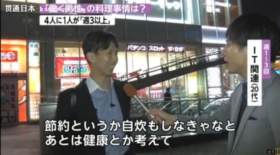 程序员小哥接受采访(富士电视台) 负责调查的相关人士也走上街头,问了问行人关于男性做饭的看法。一位20多岁的程序员表示自己一周做1到3次饭,他说:“偶尔早回去的话,我就做炒面之类的。也是为省钱,也是为健康。”