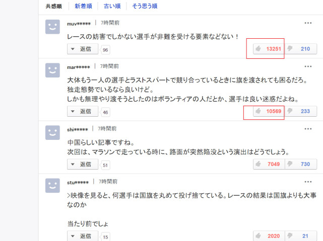 腾讯体育11月21日(文/应虹霞)太湖马拉松赛中国选手在冲刺时被志愿者干扰,导致被非洲选手拉开距离最终屈居亚军,此事今天晚间上了日本雅虎体育头条,引发日本网友火爆热议,并一边倒地力挺受到干扰的运动员。 “对于选手来说,这是彻头彻尾的干扰。他没有任何过错,没有人有资格指责他。”在雅虎体育该新闻后的跟贴中,一名日本网友如此力挺被干扰的运动员本人。这条评论短短数小时就集到了超过13000个赞,高居跟贴置顶,“怎么能指责运动员呢?该受指责的是那名志愿者!” “问题在于当时的情形是,她正在与另一名选手进行最后的争夺,所以被猝不及防地递过来国旗,很是苦恼吧。假如她是一骑绝尘,那还好说。”这条日本网友的跟帖也集了超过10000个赞,排在跟贴第二位。 日本网友也热烈讨论了国旗和比赛结果哪个重要。“一名马拉松选手在微博上说,从视频来看,(何引丽)选手把国旗揉成一团丢在了一边,他问,难道比赛结果比国旗还重要?”一名日本网友这样抛出提问,结果立马激起了“当然!”“比赛中当然比赛才是第一位的!”的回响。 说到此次马拉松事件,有日本网友也再次老调重弹地提到了所谓“中国人没素质”的问题,“中国的五星级酒店都可以用客人用过的毛巾擦拭杯子,可见中国人的素质有多差,所以他们也无法理解,(给马拉松选手递国旗)一事有多么糟糕。” 本文系腾讯体育独家稿件,未经授权,不得转载,否则将追究法律责任。 |