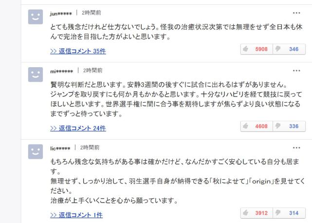 腾讯体育11月29日(文/应虹霞)“很遗憾!”“明智的决定!”日本花滑王子,消息第一时间上了日本雅虎体育头条,并引爆了日本网友巨大反响和集体力挺,可见羽生结弦的号召力。 羽生结弦退赛消息发布后的短短两个小时,日本雅虎网络置顶跟贴收集了超过5900个赞。日本网友“jun***”在该置顶跟贴中写道,“这是一个十分遗憾的消息,但也是无可奈何。希望他不要勉强自己,要根据自身伤愈的情形来决定要不要出战全日本锦标赛。最好是力争彻底痊愈后再复出。” 日本网友对羽生结弦退赛的决定表示支持和理解 “明智的决定!静养三周后立马复出比赛,肯定不可行。而且要恢复跳跃,还需要再花费好几个月的时间。希望他经过充分的康复治疗后再复出竞技。尽管也期待他能够赶上世锦赛,但我们也不会着急,会一直等待他恢复到良好的状态。”这条贴子被置在跟贴第二位的位置,也同样收集到超过4600个赞。 也有不少日本网友说,听到这一消息,从羽生结弦的角度着想,反而为他感觉到很安心。“听到这个消息当然很遗憾,但不知咋的,也感觉很安心!希望他不要勉强自己,好好养伤,再向我们展示他自己满意的《秋日》和《原点》。衷心祈祷他治疗顺利!” |