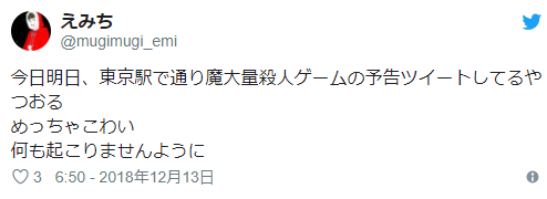 えみち:有个人在推特上发预告说今明两天在东京站的街上要进行大型杀人游戏。太可怕了吧。希望什么都别发生。