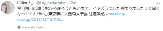 LYO:听说在东京站有杀人预告。好可怕啊……女性们都要注意安全!!