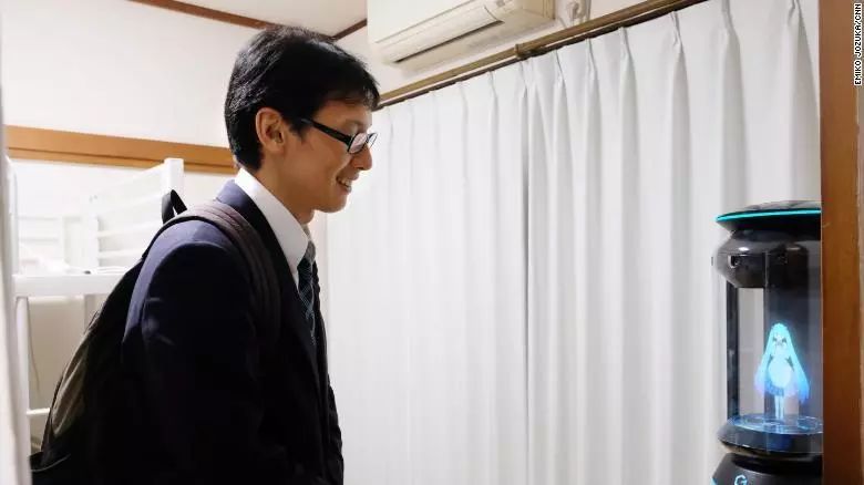 近藤明彦今年35岁,是日本一所学校的行政人员。 他的“妻子”初音未来被称为“世界第一虚拟偶像”,因为一首《甩葱歌》火爆网络。初音未来原本是一个音乐合成软件,2007年8月31日,crypton公司卖第二代软件时,推出了“虚拟歌姬”的理念,于是初音未来顺势而生。 初音未来的设置为16岁,有着绿色的双瞳和绿色的双马尾,身材娇小,声音卡哇伊到爆炸。其后,初音未来做代言、接广告、开演唱会,几乎成为日本“全民少女偶像”。 近藤明彦也没能“逃过”初音未来的魅力。 近藤明彦称,十年前首次听到初音未来的音乐时,他就爱上了她。而与他“结婚”的这个初音未来,是一个闪烁在Gatebox设备中通过全息投影技术投射出的影像。这个设备由日本创业公司Vinclu创建,使得动漫迷能与自己喜爱的动漫角色共处。