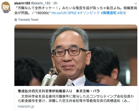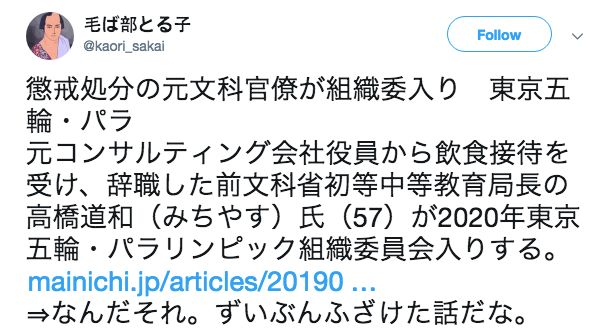 然而今年1月4日,高桥道和被正式任命为东京奥组委官员。据《读卖新闻》,高桥将担任局级职务。 文科省表示,高桥从2015年10月至2017年7月担任体育厅次长,推进了东京奥运的准备工作,考虑到他的经验,作出这一人事任命。 在推特上,许多日本网友表达了强烈不满,多数人认为背着贪腐污点的官员如此迅速复出,影响政坛风气。 日本文科省成贪腐“热地” 据《产经新闻》,2017年1月,文科省事务次官(“二把手”)前川喜平引咎辞职,原因是文科省被曝“下凡”风盛行。