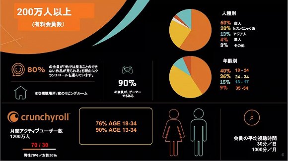 总体来说,年轻的白人男性是Crunchyroll会员中最为主要和活跃的群体。 而这也是Crunchyroll多年发展过程中始终以服务新一代动漫迷为目标、深入粉丝文化经营的结果。围绕着动漫迷的爱好和需求,Crunchyroll的业务板块早已不限于动画和电视剧视频的提供,在阅读(漫画)、交流(新闻、社交、线下活动)、游戏以及电商贸易领域,Crunchyroll均已涉足。 Crunchyroll的漫画服务正式开通于2013年。2015年10月Crunchyroll 和住友商事共同成立了一家动画制作投资公司,开始涉足动画制作领域。2017年8月,Crunchyroll母公司Ellation、住友商事以及日本移动互联网公司GREE共同宣布,展开将日本动画游戏化并向海外发行的合作声明。另外,线下活动方面,一年一度为期3天的漫展Crunchyroll Expo,在2018年的9月份达到4.5万参加者的规模。而从2017年开始的年度线上票选活动The Crunchyroll Anime Awards也获得了不少关注。