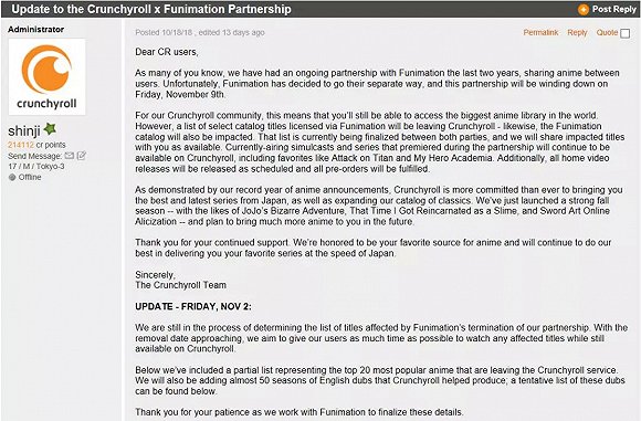 但索尼的这一行动,对于Crunchyroll来说意义远非如此。 2016年,Crunchyroll和Funimation曾达成一项合作,共享部分流媒体视频内容库、译制片以及DVD经销合作。但这一合作关系结束在了2018年11月9日。Crunchyroll的创始人之一、社区管理者shinji在官网上略感遗憾地向用户发布了这一消息。Funimation的合约解除,直接给Crunchyroll的片源库造成冲击。