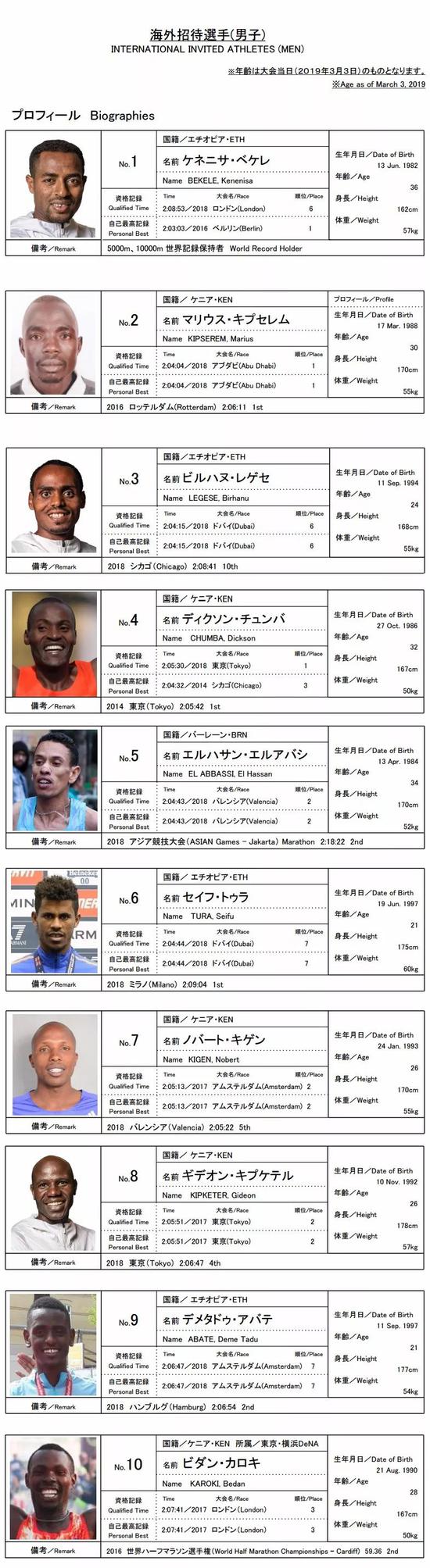 资料图。 2019年3月3日即将举办的东京马拉松,昨天公布了精英选手名单,亮点颇多。 5000和10000米世界纪录保持者、全马2:03:03的贝克勒被邀请参赛,成为本届比赛最大牌选手。 日本国内特邀选手方面,去年10月在芝加哥马拉松上创造日本马拉松国家纪录的大迫杰将参加。而去年在东京马拉松上跑出2:06:11,刷新日本国家纪录的设乐悠太则因伤病未完全恢复无缘今年的比赛。 川内优辉则没有出现在特邀名单上。 今年东京马拉松海外特邀选手名单: