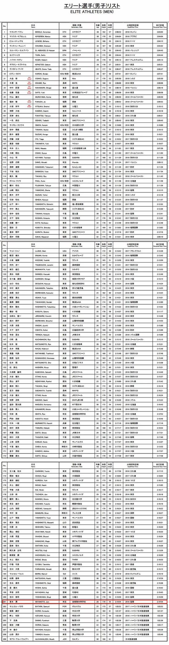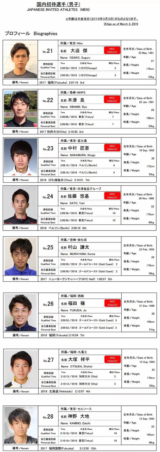 今年东京马拉松日本国内特邀选手名单( 红色字体标记 表示已获得MGC资格) :