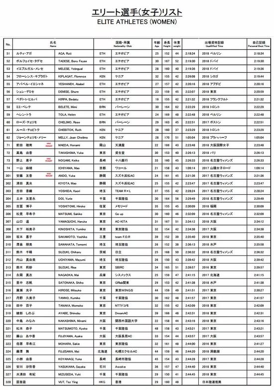 今年东京马拉松男子精英选手名单(红色字体标记表示已获得MGC资格) 从这份名单中可以看出,刨去国外精英选手,PB在2:10以内的日本选手多达10人,而PB在2:20以内的更是多达187人。 今年比赛可能会出现在这样的情况:跑2:20左右的成绩,可能连前150名甚至200名都进不去。日本军团整体实力真是太强悍了。 4、女子精英阵容:4位PB2:20以内