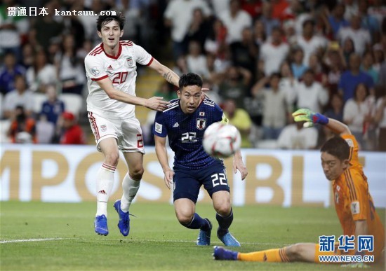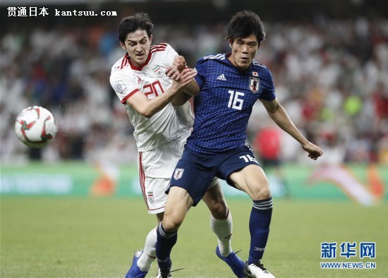 1月28日,日本队球员富安健洋(右)防守伊朗队球员萨达尔·阿兹蒙。 当日,在阿联酋艾因举行的2019年亚洲杯足球赛半决赛中,日本队以3比0战胜伊朗队,晋级决赛。 新华社记者丁旭摄