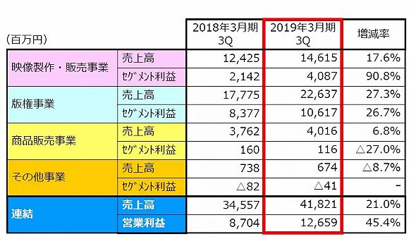 影像制作和贩卖事业方面,剧场版动画部门来自《龙珠超:布罗利》的制作费用带来大幅增收。海外影像部分,中国和北美市场的网络播放权的购买增长,以及手游《圣斗士星矢:银河魂》的运转良好,促使相应收益增长。但TV动画部门,因播出的动画仅《ONE PIECE》《光之美少女》《咯咯咯鬼太郎》《爆钓王》《屁屁侦探》5部,比去年同期的6部有所减少,因而营收也相应减少。内容商品(主要指光碟等)方面也因缺少热门作品较前年同期收益下滑。综合以上情况,影像制作和贩卖事业在该季度销售额达146.15亿日元,营业利润达40.87亿日元,同比增幅90.8%。