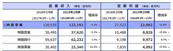在前三个季度中(2018.3.1-2018.11.30),东宝累计营收1884.51亿日元,同比下降1%,营业利润355.52亿日元,同比减少10.9%,经常利润368.57亿日元,同比减少10.2%,归属母公司股东当期纯利润238.22亿日元,比去年同期下滑15.6%。 与动画相关的业务主要在电影制作事业板块(包括电影经营、电影公映、影像)。 作为主力的电影事业,三季度累计营收1231.93亿日元,同比减少4.2%,营业利润228.93亿日元,同比下滑16.8%。与前一年同期相比,没有了《新哥斯拉》和《你的名字。》的光碟销售加持,是形成减收减益的主要原因,