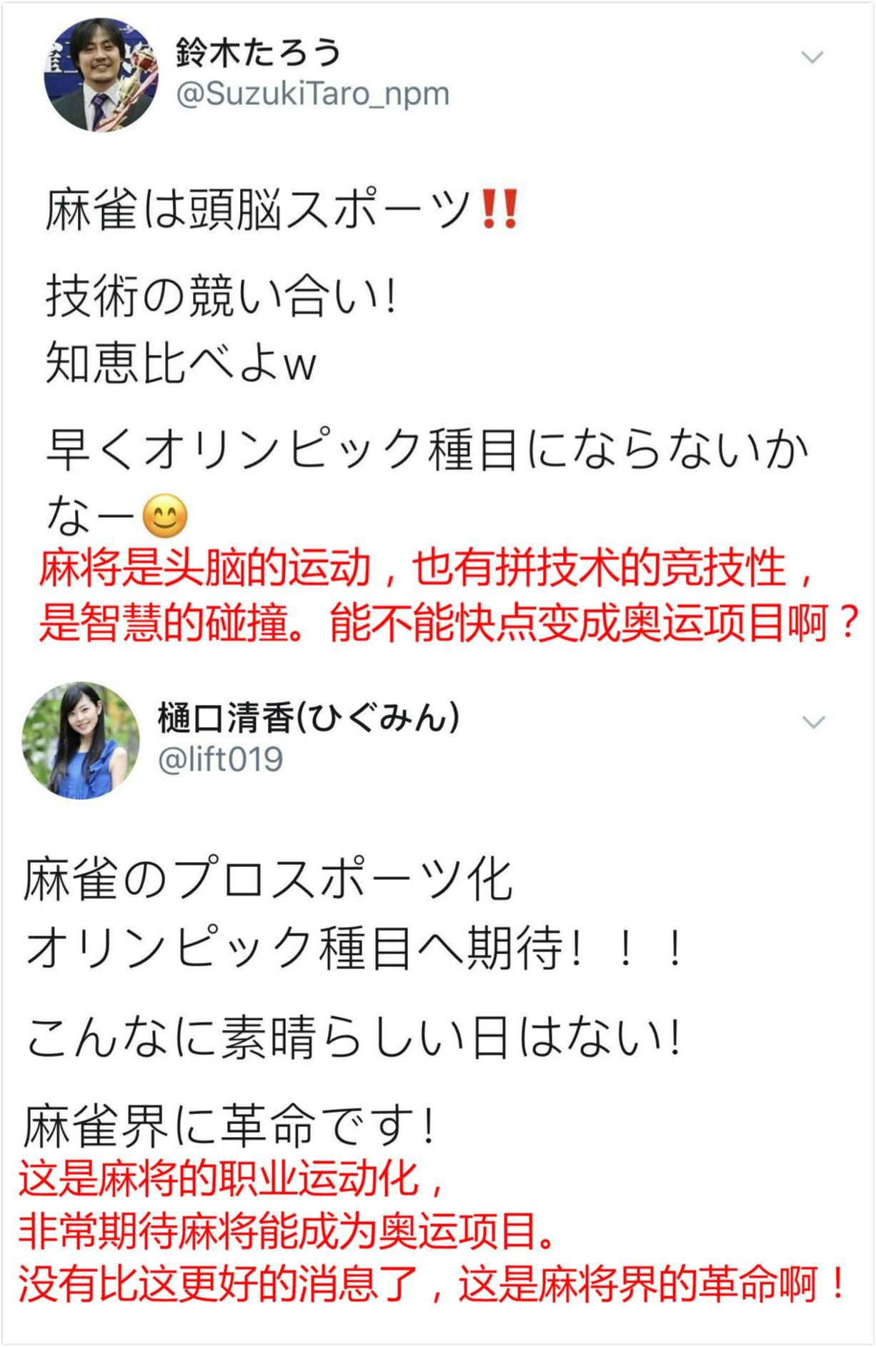 还有日本网友不忘提醒,还是得区别对待健康的搓麻和赌博哦,“提倡健康麻将,这才是以成为奥运项目为目标的麻将,赌博的麻将没有未来。”