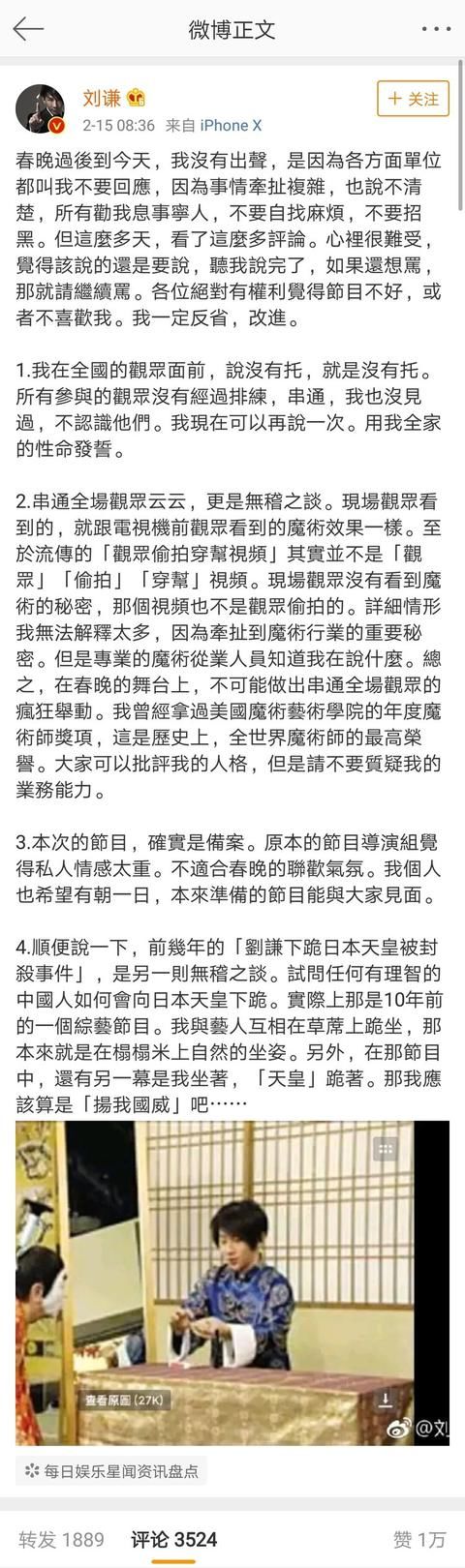 刘谦微博全文如下: 春晚过后到今天,我没有出声,是因为各方面单位都叫我不要回应,因为事情牵扯复杂,也说不清楚,所有劝我息事宁人,不要自找麻烦,不要招黑。但这么多天,看了这么多评论。心里很难受,觉得该说的还是要说,听我说完了,如果还想骂,那就请继续骂。各位绝对有权利觉得节目不好,或者不喜欢我。我一定反省,改进。 1、我在全国的观众面前,说没有托,就是没有托。所有参与的观众没有经过排练,串通,我也没见过,不认识他们。我现在可以再说一次。用我全家的性命发誓。 2、串通全场观众云云,更是无稽之谈。现场观众看到的,就跟电视机前观众看到的魔术效果一样。至于流传的“观众偷拍穿帮视频”其实并不是“观众”“偷拍”“穿帮”视频。现场观众没有看到魔术的秘密,那个视频也不是观众偷拍的。详细情形我无法解释太多,因为牵扯到魔术行业的重要秘密。但是专业的魔术从业人员知道我在说什么。总之,在春晚的舞台上,不可能做出串通全场观众的疯狂举动。我曾经拿过美国魔术艺术学院的年度魔术师奖项,这是历史上,全世界魔术师的最高荣誉。大家可以批评我的人格,但是请不要质疑我的业务能力。 3、本次的节目,确实是备案。原本的节目导演组觉得私人情感太重。不适合春晚的联欢气氛。我个人也希望有朝一日,本来准备的节目能与大家见面。 4、顺便说一下,前几年的“刘谦下跪日本天皇被封杀事件”,是另一则无稽之谈。试问任何有理智的中国人如何会向日本天皇下跪。实际上那是10年前的一个综艺节目。我与艺人互相在草席上跪坐,那本来就是在榻榻米上自然的坐姿。另外,在那节目中,还有另一幕是我坐着,“天皇”跪着。那我应该算是“扬我国威”吧!