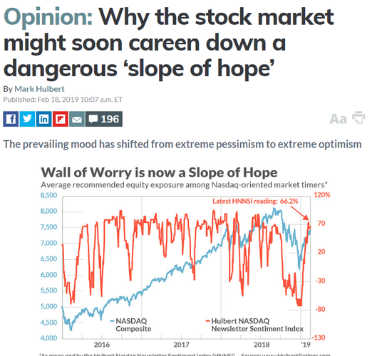 上周五三大指数以大涨结束了一周的交易,但是华尔街目前的情绪指数正在闪烁着短期的危险信号。 那是因为市场情绪已经从12月底盛行的极端悲观情绪转变为如今的极端乐观情绪。有些人称目前的情况为“希望的斜坡 ”。 Hulbert Nasdaq Newsletter Sentiment Index(HNNSI)是衡量纳斯达克股票的平均推荐指数,是一个可以衡量市场情绪的指数。该指数在去年12月的时候非常低,达到了-72.2%——这是2000年以来该指数的最低值 。 之后发生的事大家也知道了,股市在进入2019年以后出现了强力反弹。所以这个指数在某种程度上是一个反向指标。 而如今,相反,在标普500上涨17%以上、纳斯达克出现20%以上的涨幅后,HNNSI的值是正的73%。高于自2000年以来90%的所有可比较数据的。换句话说,从附图中可以看出,在六周的时间内,这个平均推荐指数上涨了超过140个百分点:远远离开了超级看空区域(推荐客户将四分之三的投资组合分配给做空股票)基本达到超级看涨区域(推荐客户用投资组合的四分之三买入股票)。 关于HNNSI作为反向指标的另一个限定条件:它仅作为一个非常短期的时间指标,最多可以提供市场最近几个月趋势的信息。因此,当前市场情绪与反向分析并不矛盾,股市可能会在今年晚些时候进入新的重要的歷史高点。 然而,这个反向指标真正告诉我们的是,即使今年市场创下新高,之前也可能也会先出现一波下跌的行情。因此投资者还需要根据现实情况做出决定 。 |