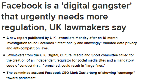 在针对Facebook和其他社交媒体公司在传播“假新闻”和造谣等方面发挥的作用进行的为期18个月的调查结束后,英国数字、文化、媒体和体育委员会(Digital, Culture, Media and Sport committee,DCMS)周一发布了最终报告。在这份长达108页的报告中,英国议员们呼吁为社交媒体网站建立一个独立的监管机构,并制定强制性行为准则,并对违反条款者处以“巨额罚款”。报告称,“像Facebook这样的公司不应该被允许在网络世界中表现得像‘数字黑帮’ ,他们认为自己凌驾于法律之上 。” 该委员会指责Facebook首席执行官马克-扎克伯格(Mark Zuckerberg)“藐视”英国议会,拒绝到该议会发表证词 。去年,扎克伯格参加了美国和欧盟议会的听证会,到堂陈述该公司的数据收集行为,但仅派该公司的其他人代其到英国参加听证会。 英国立法者周一表示,他们发现Facebook故意“突破其用户的隐私设置,将个人数据转交给一些应用程序开发者。”他们在报告中敦促英国数据保护委员会和反垄断管理机构对其做法进行详细调查。英国立法者表示:“很明显,Facebook明知故犯地违反了数据隐私和反垄断法。” 该报告对英国政府上周发布的一份独立调查报告表示欢迎,该报告呼吁对Facebook和谷歌等搜索和社交媒体公司在网络广告中的垄断行为进行反垄断调查。 彭博社 欧央行首席经济学家:若经济前景恶化 或调整利率展望