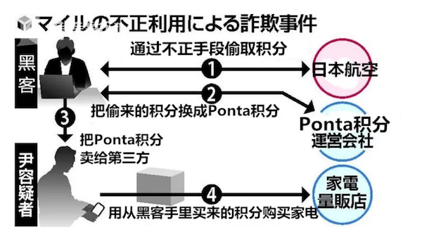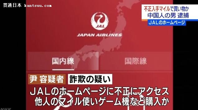 被逮捕的中国籍男子尹某 NHK报道截图 警视厅指出,由于日本航空会员的里程可以兑换成积分,再通过积分兑换成消费积分,黑客会首先盗用里程兑换成消费积分后再以8折价格出售。因为贪便宜购买了这些积分并使用了的尹某,不知不觉就构成了违法行为。