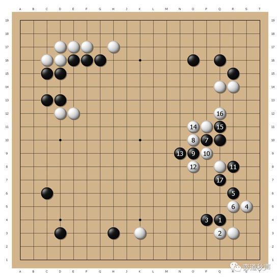 黑1暂时不理右边,肩冲右下三三,好想法! 白2、4跟应后,黑5飞压,诱使白6来冲。 黑7、9再回到右边,白10断时,黑11托恰到好处。 白12打、14粘上,硬撑住棋形。 黑15拐一下,黑17虎住,棋形饱满。 接下来—— 图五 (实战图续)