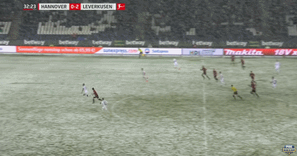 停门线上了 自然天气是足球比赛中不可忽视的一个因素,在昨晚的德甲联赛中,就出现了这么一幕。 保级球队汉诺威与勒沃库森的比赛遭遇大雪,他们在开场不到30分钟的时候就两球落后,随后日本国脚原口元气获得了缩小比分差距的良机!他反越位后晃过门将一脚推射,皮球缓慢的向空门滚去。