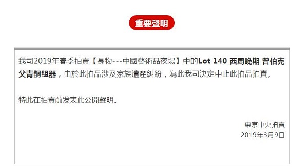 日本东京中央拍卖发布的中止拍卖声明 日本东京中央拍卖公司前天在其官网发布声明,称“西周晚期曾伯克父青铜组器拍品涉及家族遗产纠纷,决定中止此拍品拍卖。” 据此前拍卖方公开的资料,此套曾伯克父青铜组器原定于3月12日晚现身东京圆顶饭店璞利斯姆大厅的东京中央拍卖的“长物·中国艺术品夜场”拍卖,此组青铜器为周代曾国高级贵族克父所有,包括鼎、簋、壶、甗、霝、盨等六大类共八件,每件器物上均铸有子孙颂扬先祖之德,以求子孙万代得以庇佑的铭文,少则八字,多则百字。其内容对于书法艺术及青铜学术研究有著极其重要的作用。
