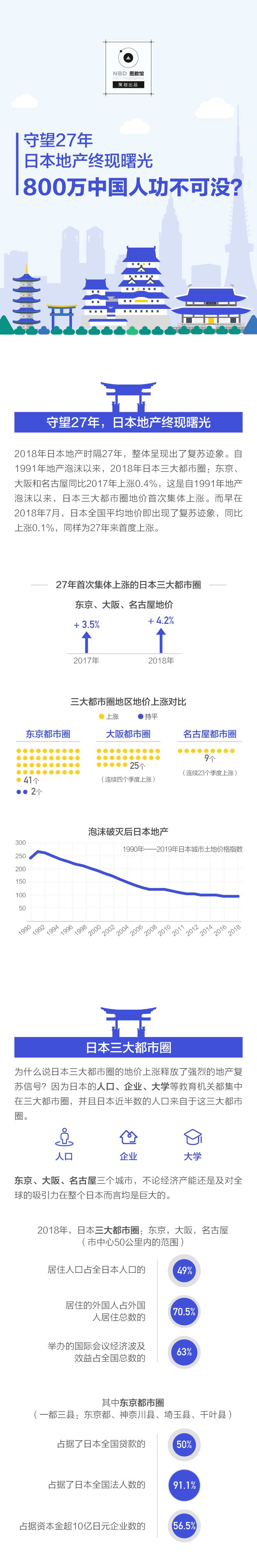 原标题:熬了27年,日本地价终于涨了:这800万中国人功不可没? 来源:每日经济新闻 6大主要城市地价37年上涨211倍,这是日本在1955年到1991年所创造的地产奇迹,然而高度泡沫化的日本地产在随后的26年却经历了更为惨烈的下跌。截至2017年,六大主要城市住宅用地价格相比1991年高点跌幅超60%,而日本所有城市地价也已腰斩。 不过,2018年日本地产终于迎来了曙光,不论是全国整体地价还是汇聚了日本近半人口的三大核心都市圈,地价均在去年收获了27年来首次上涨。日本地产复苏的背后,除了日本整体经济的复苏以外,也依赖于近年旅游业的爆发,其中800万中国游客更是成为拉动日本地产复苏的关键因素。