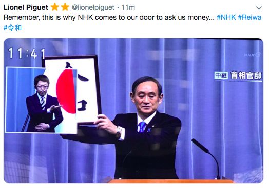 NHK在直播过程中,当官房长官举起新年号的牌子的一瞬间,现场主持人画面刚好挡住。网友吐槽,这就是付费看NHK的结果。
