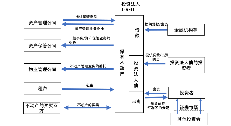2.2 公开发行形式 2.2.1投资法人(J-REITs) 根据投信法之规定,以运用从投资者处募集而来的资金为目的而设立的法人组织称之为投资法人。投资法人比较类似于国内的公募基金的形式,但又有所不同。这体现在国内的公募基金是证券投资基金,投资对象为有价证券。而日本的投资法人的投资对象除了有价证券以外还包括了不动产。J-REITs采用的是投资法人的方式,(即以公开上市发行”投资口”相当于公司股票)、发行公司债的方式筹集资金,投资法人结构在满足一定的条件下,也可实现股东分红的税前抵扣而回避双重征税。