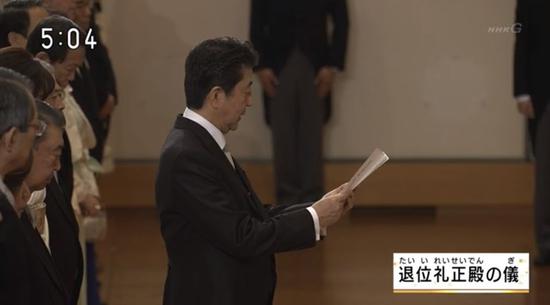 讲话内容如下: 根皇室石典范特立法,天皇陛下将于今日退位。 平成的三十年,在“内平外成”的指导思想下,我们与天皇陛下并肩前行。在此期间,天皇陛下为了国家的安宁与国民的幸福祈愿,认真完成一件又一件公务,肩负起了日本作为一个国家以及日本国民的象征的责任。 我国在享受和平与繁荣的同时,也遭受了一次又一次自然灾害的打击,多次直面困难。 在这些时刻,天皇陛下与皇后陛下一同,关怀国民,亲身前往灾区慰问,为日本国民带来明日的勇气与希望。 今天在这里,天皇迎来退位之日,心念这些年度过的岁月,天皇无时无刻不与日本国民同苦乐的细心,我在这里再次表示最深刻的敬爱与感谢。 我们将把天皇陛下的脚印铭记在心,和平又满怀希望的,为了我们创造能让我们更为自豪的日本,更加竭尽全力。 祝愿天皇与皇后两位陛下永远康健。在这里,从心底对两位陛下表示感谢,祝愿皇室能更加繁荣。 随后,明仁天皇发表了在位最后的讲话。